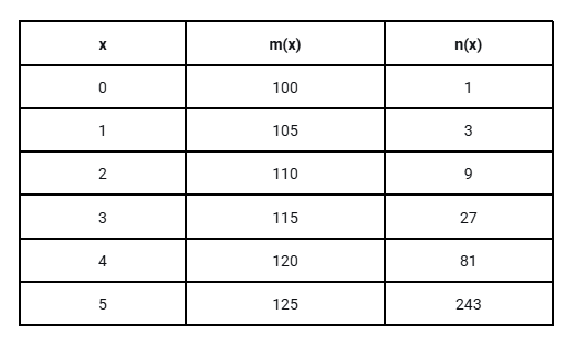 - n(x) > m(x) for x ≥ 4. The exponential function, which triples, has surpassed the linear function that only adds 5 each time.